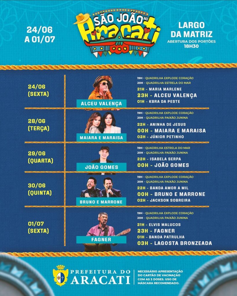 A primeira noite do São João no Aracati foi marcada pela emoção do retorno das festas juninas. No palco, o cantor pernambucano Alceu Valença trazia os “seus sinais”, sinal de alegria e o mais tradicional forró Gonzaguiano. Na arena montada no Largo da Matriz milhares de pessoas dando viva a São João e dançando o forró pé de serra.