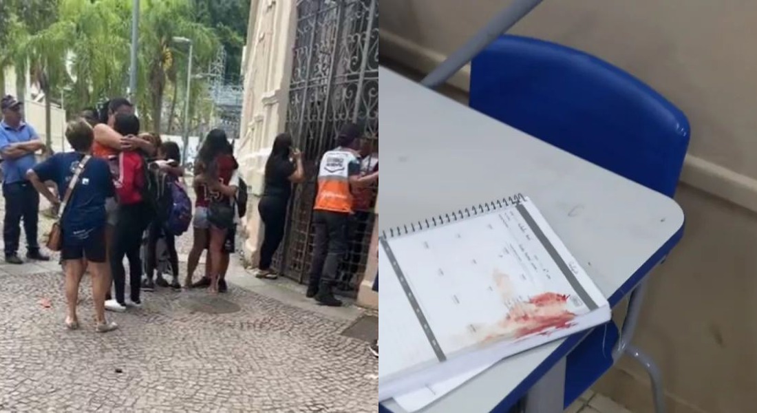 Imagens compartilhadas nas redes sociais mostram um caderno ensanguentado sobre uma carteira dentro de uma sala de aula.
