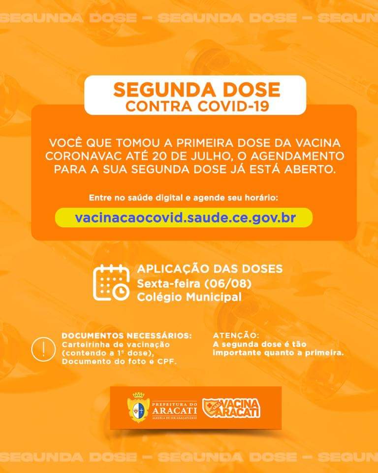 A Prefeitura do Aracati, através da Secretaria de Saúde, abriu na manhã desta quinta-feira (05), agendamento para aqueles tomaram a primeira dose da vacina Coronavac até 20/07.