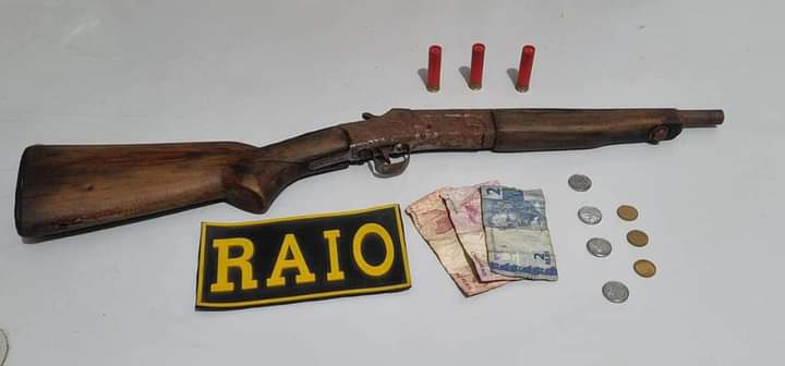 Material apreendido: 01 espingarda Cal. 32, de marca e numeração não identificada; 03 munições de Cal.32 intactas; e R$ 19,30 em moeda nacional.