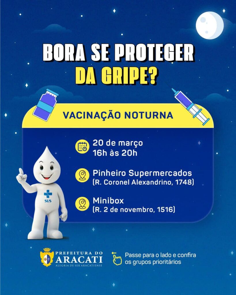 A campanha de vacinação contra a gripe já começou e Aracati está intensificando os esforços. No dia 20 de março, das 16h às 20h, haverá vacinação noturna no Supermercado Pinheiro, loja Shopping Bom Vizinho e no Supermercado Minibox, loja da rua 02 de novembro.