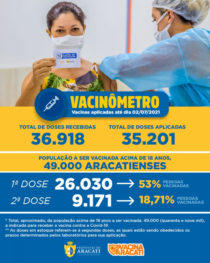 Segundo o último vacinômetro, divulgado pela Prefeitura do Aracati, com dados da Secretaria de Saúde, o município já recebeu 36.918 doses de vacinas contra a Covid-19, sendo aplicadas 35.201 delas na população. O levantamento é referente às vacinas aplicadas até o dia 02 de julho de 2021.