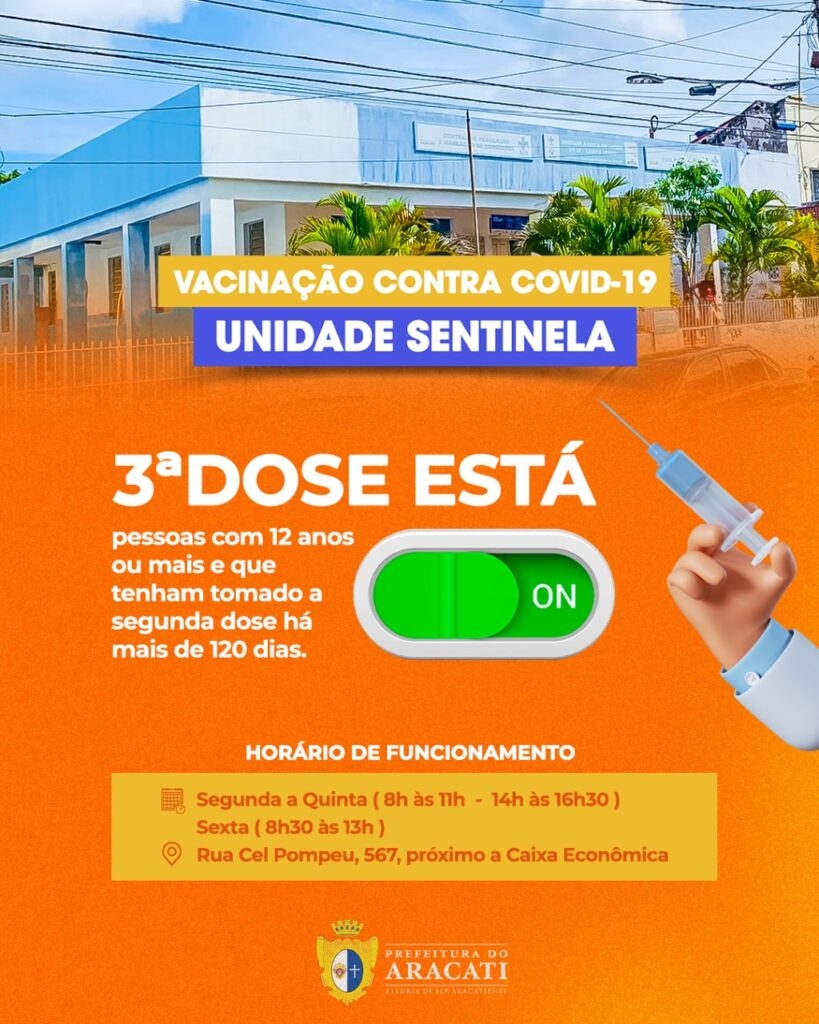 A Prefeitura do Aracati, através da Secretaria de Saúde, divulgou nesta segunda-feira (30), que pessoas de 12 anos ou mais já podem tomar a terceira dose contra a Covid-19.