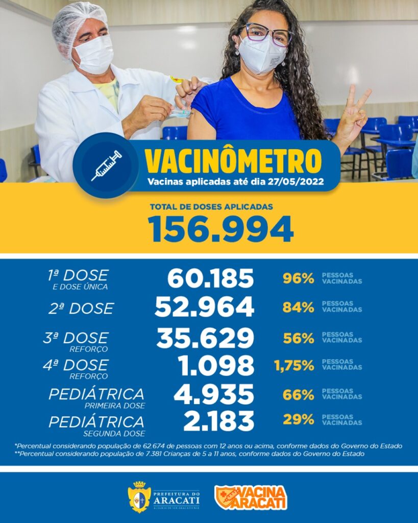 “Considerando uma população 62.674 habitantes no Aracati acima de 12 anos, já somos mais de 96% dessa faixa etária que tomou a Primeira Dose , 84% a Segunda Dose, 56% com a Terceira Dose”, completou a gestão.