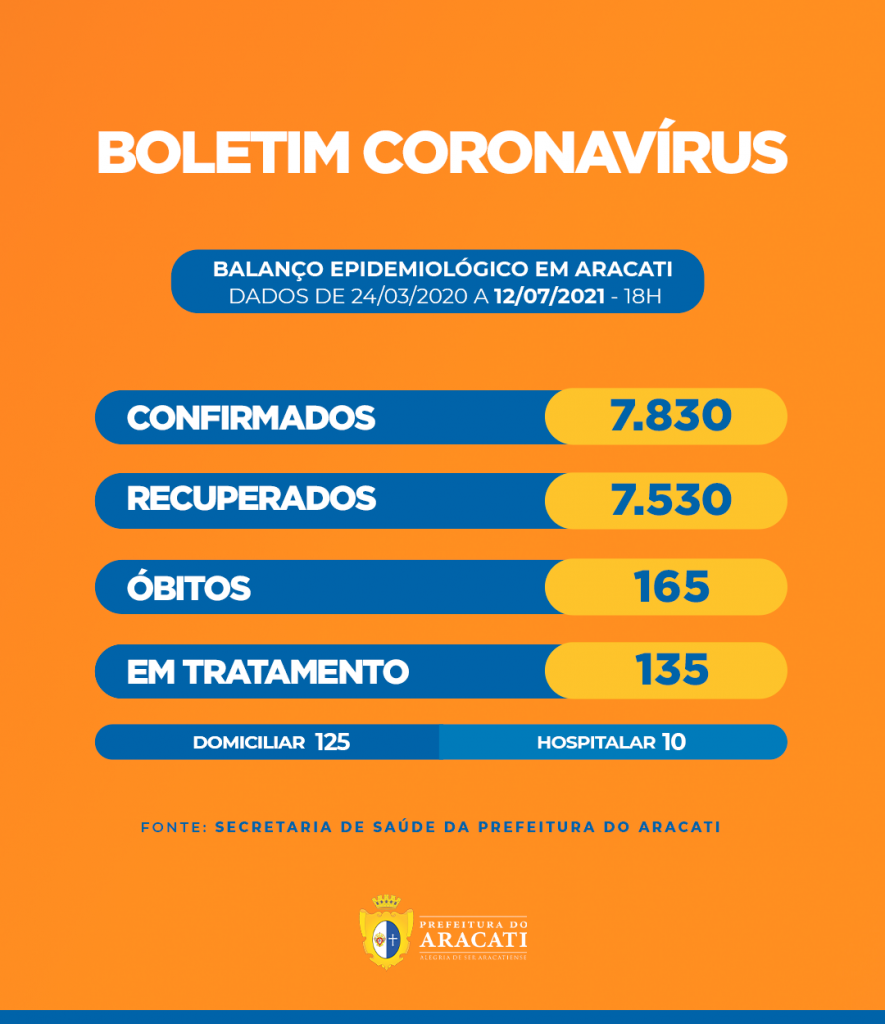 A Prefeitura do Aracati, através da Secretaria de Saúde, divulgou na noite desta terça-feira (13) o boletim epidemiológico atualizado da Covid-19 no município, com informações atualizadas desde o início da pandemia até esta segunda (12), às 18h.