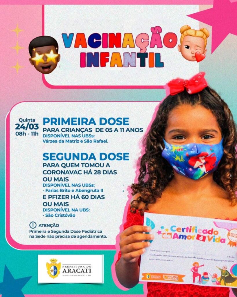 Nesta quarta-feira (23), a Prefeitura do Aracati, através da Secretaria de Saúde, divulgou calendário de vacinação contra Covid-19 de crianças de 5 a 11 anos.