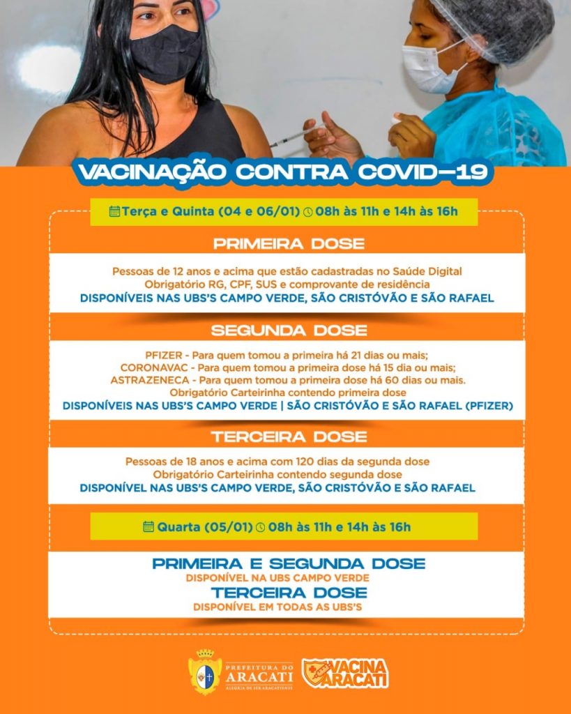 Sobre a vacinação contra a Covid-19 no município de Aracati, a prefeitura divulgou um infográfico contendo todas as informações sobre a três doses da Pfizer, Coronavac e Astrazeneca. Você confere abaixo ou clicando aqui para mais informações.