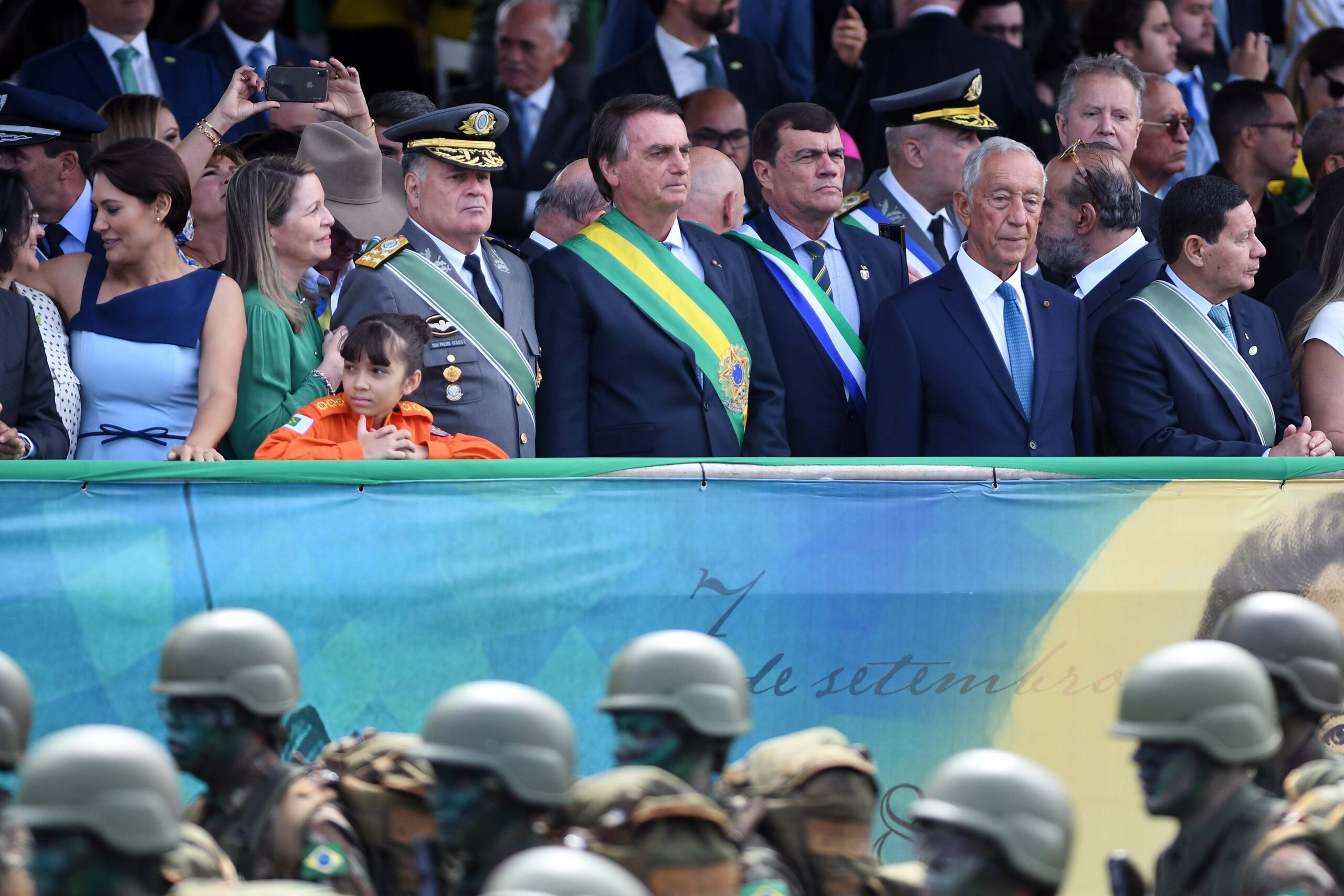 O presidente Jair Bolsonaro (PL) cercou-se de militares no palanque do 7 de Setembro em Brasília. Sem a presença de chefes de outros Poderes e em meio à campanha de contestação do Judiciário e do sistema eleitoral, o cerimonial mudou a disposição dos anos pré-pandemia, colocando os três comandantes militares atrás de Bolsonaro (antes eles ficavam ao lado, mais distantes).