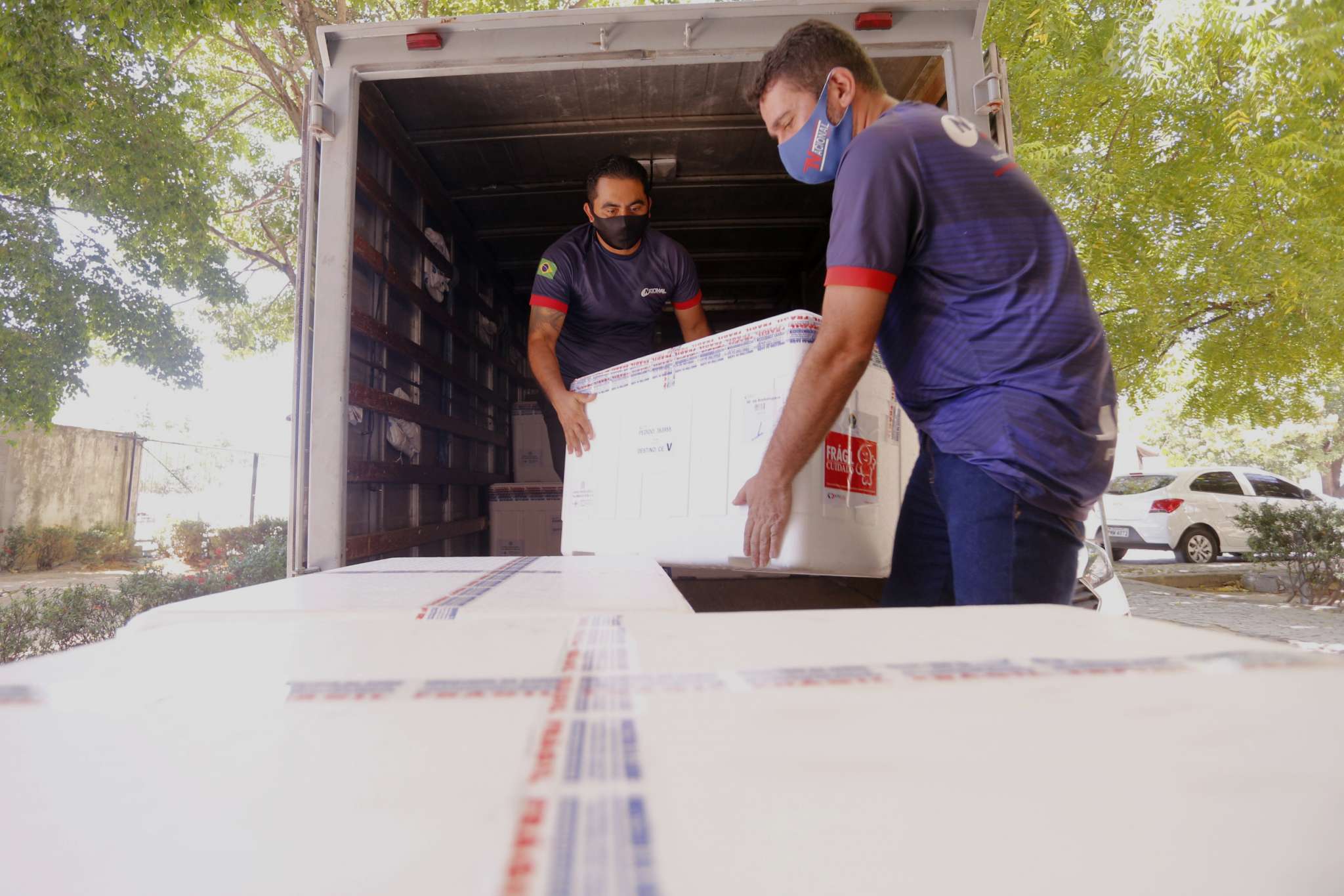 Duas novas remessas de vacinas contra a Covid-19 desembarcaram no Aeroporto Internacional de Fortaleza nesta quinta-feira (16). O primeiro lote, com 104.130 doses da Pfizer/BioNTech, chegou por volta das 10h30. A segunda carga, com 36 mil doses da AstraZeneca/Fiocruz, foi recebida às 18 horas, e será destinada para aplicação da segunda dose na imunização da população em geral.