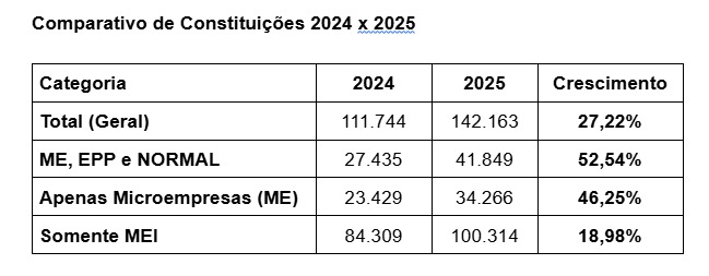 O grande destaque do balanço, no entanto, é o salto nas categorias que exigem maior estruturação jurídica e contábil. Enquanto o número de Microempreendedores Individuais (MEIs) apresentou um crescimento de 18,98%, as empresas que não se enquadram nesse regime (ME, EPP e Normal) tiveram uma alta de 52,54%.
