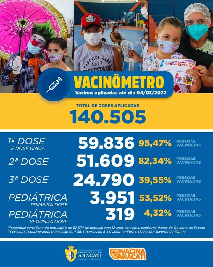 A Prefeitura do Aracati, através de dados da Secretaria de Saúde do Estado do Ceará, divulgou nesta segunda-feira (7) o vacinômetro atualizado até o dia 4 de março de 2022. Até o momento 140.505 doses foram aplicadas no município.