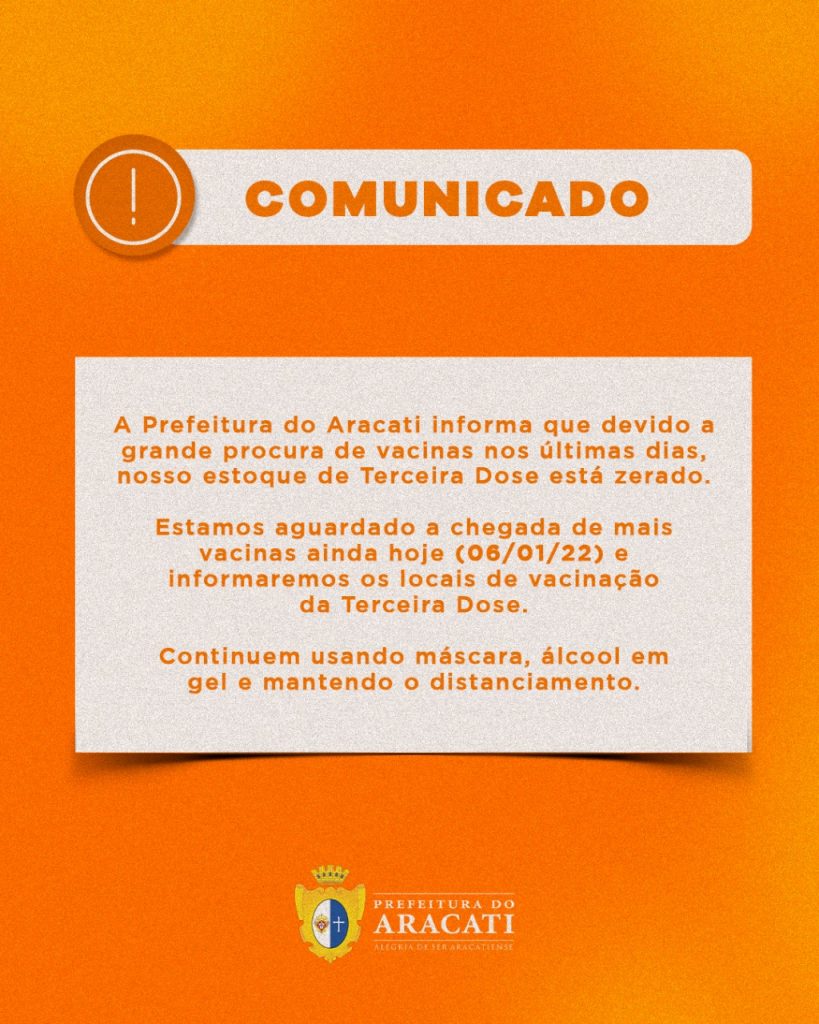 A Prefeitura do Aracati, através da Secretaria de Saúde, informou na manhã desta quinta-feira (06), que devido a grande procura de vacinas nos últimas dias, o estoque de terceira dose contra a Covid-19 está zerado.