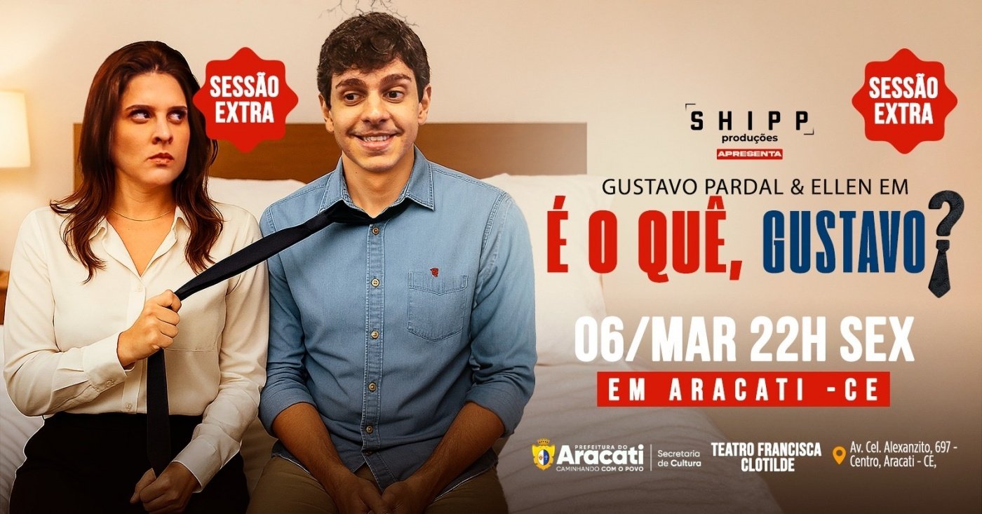 Nesta sexta-feira (6), o Teatro Francisca Clotilde, em Aracati, recebe o espetáculo de comédia “É o quê, Gustavo?”. O casal de comediantes e influenciadores Gustavo Pardal e Ellen apresentam seu show, que já é um sucesso nas redes sociais e pelo Brasil, prometendo muita risada e improviso, abordando situações cotidianas e mal-entendidos da vida a dois.