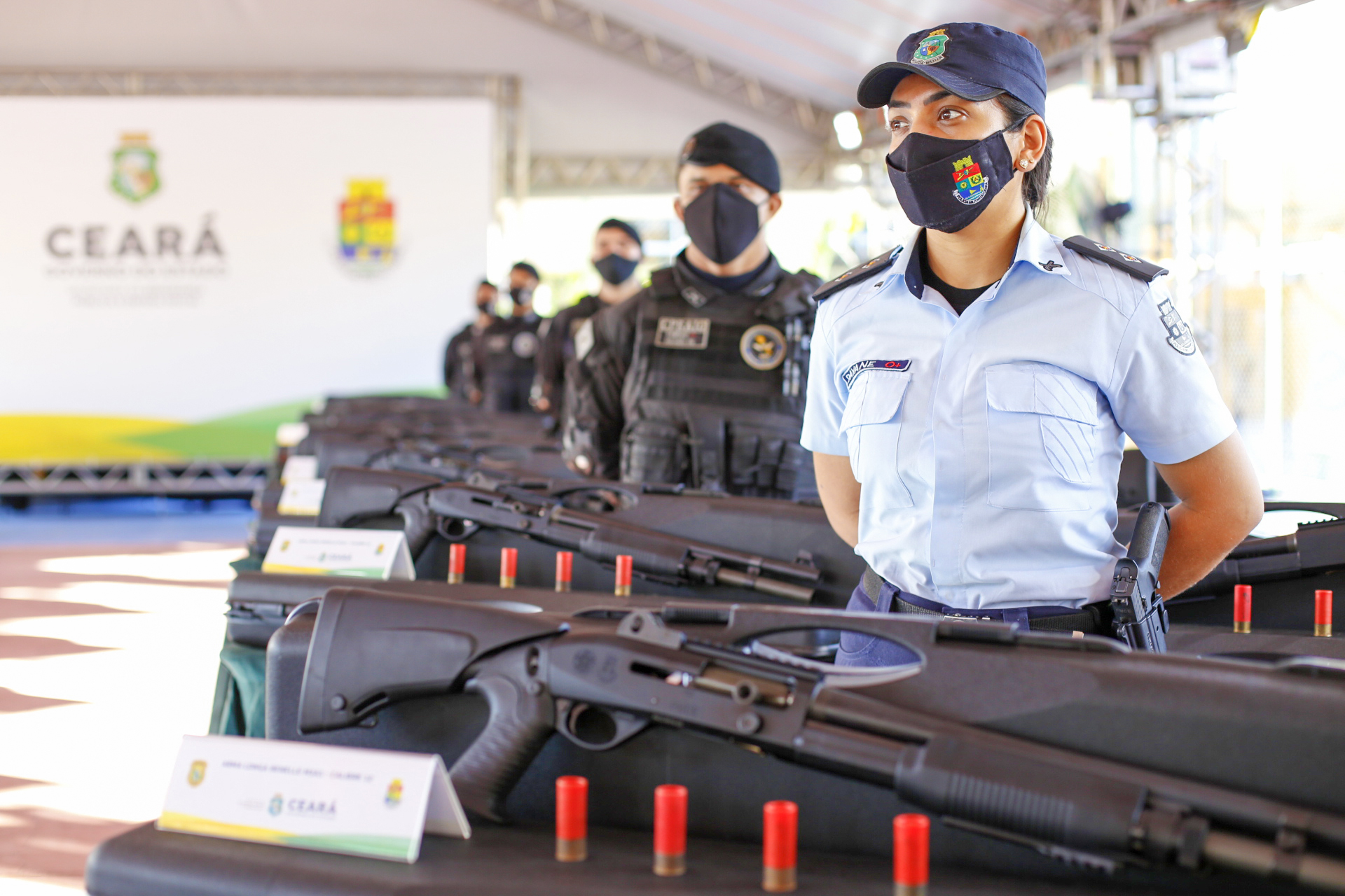 “Eu aproveito o momento para anunciar que a PMCE está fazendo neste ano a maior capacitação da história. É uma capacitação em abordagem e tiro policial defensivo, que vai atingir mais de seis mil integrantes do Policiamento Ostensivo Geral, na Capital e no Interior. Então, o policial capacitado, motivado e valorizado, e agora com mais um ato importante, estão sendo entregues oficialmente à Polícia Civil e à Polícia Militar, 844 espingardas calibre 12”, disse.
