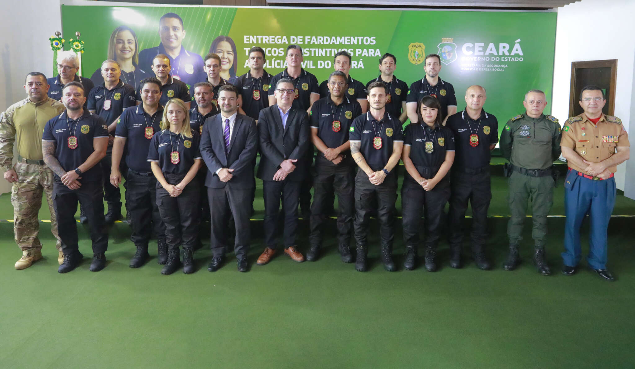 Em mais uma solenidade que mais uma vez comprovou a valorização das Forças de Segurança Pública, o Governo do Ceará entregou, na manhã desta terça-feira (27), 4.500 fardamentos táticos para a Polícia Civil do Estado do Ceará (PC-CE). O evento, que foi presidido pelo secretário executivo de Acompanhamento de Projetos Especiais, Flávio Jucá, representando a governadora Izolda Cela, ocorreu no Palácio da Abolição, em Fortaleza, com as presenças do secretário executivo da Segurança Pública e Defesa Social (SSPDS), Samuel Elânio, e do delegado geral da Polícia Civil, Sérgio Pereira. Essa é a primeira vez que foram entregues fardamentos táticos para policiais civis.
