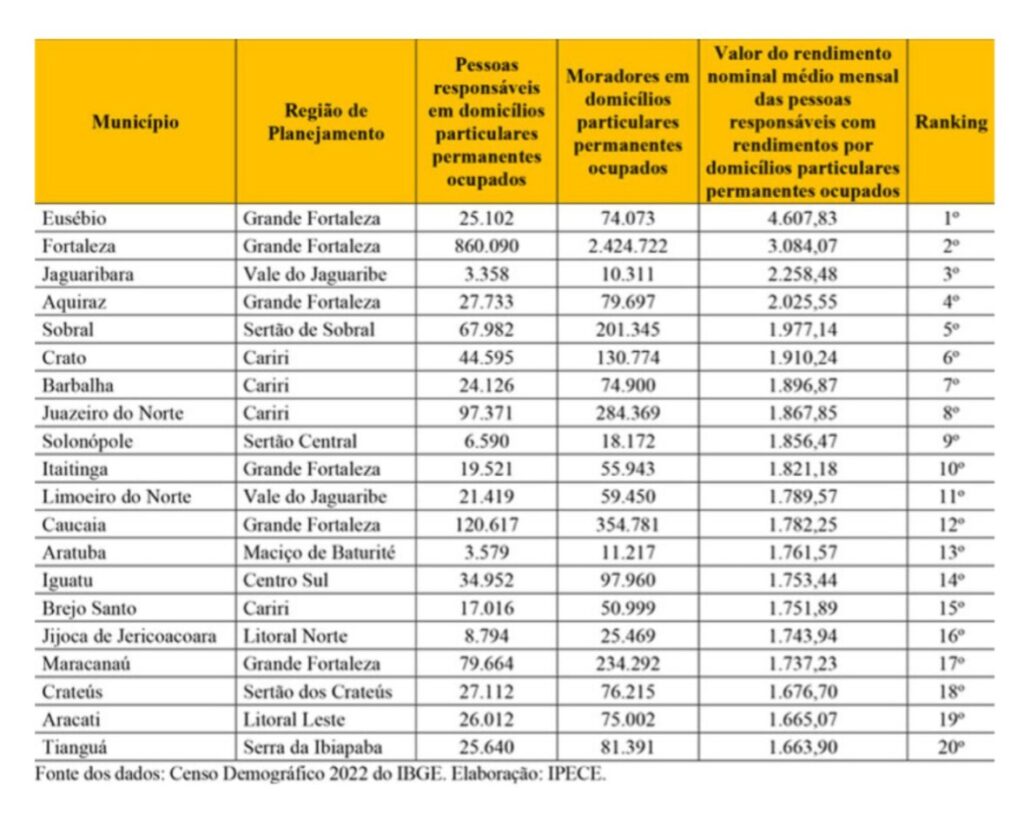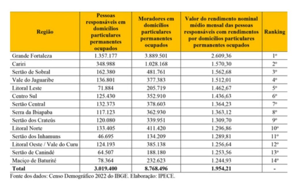 Nesta segunda-feira (21), o Instituto de Pesquisa e Estratégia Econômica do Ceará (Ipece) Informe de Julho de 2025, trouxe dados sobre as Desigualdades Territoriais de Renda no Ceará: Evidências dos Municípios e Regiões de Planejamento a Partir do Censo Demográfico 2022. E, a região do Vale Jaguaribe (4º), e Litoral Leste (5º), aparecem entre as 5 regiões do Ceará com melhores índices em renda.