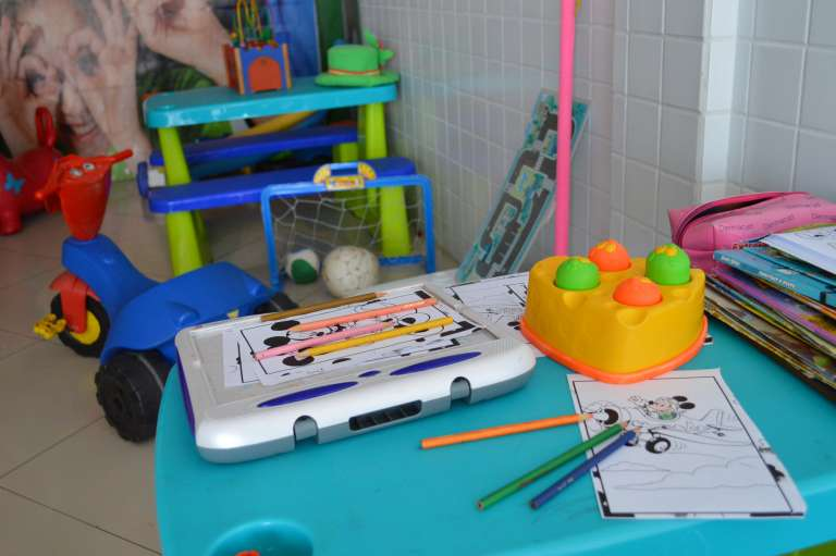Em uma sala de espera privativa e com prioridade de atendimento em relação aos outros exames, há uma brinquedoteca, com livros, escorregador, bicicletas, mesas e cadeiras coloridas, personagens infantis e cercada de brinquedos. No espaço, a criança adentra em um universo contrário àquele que acabara de vivenciar, marcado por sofrimento e dor.
