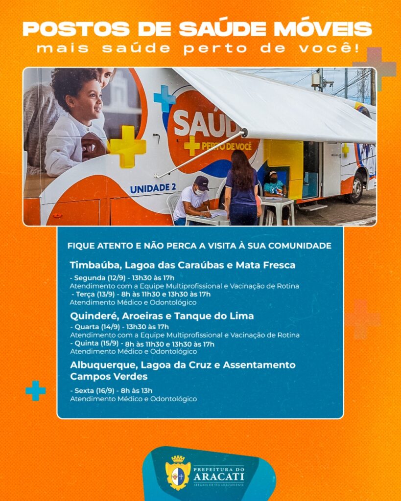 De 12 a 16 de setembro, os Postos de Saúde Móveis estarão atendendo nas comunidade de Timbaúba, Lagoa das Caraúbas, Mata Fresca, Quinderé, Aroeiras, Tanque do Lima, Albquerque, Lagoa da Cruz, Assentamento Campos Verdes.
