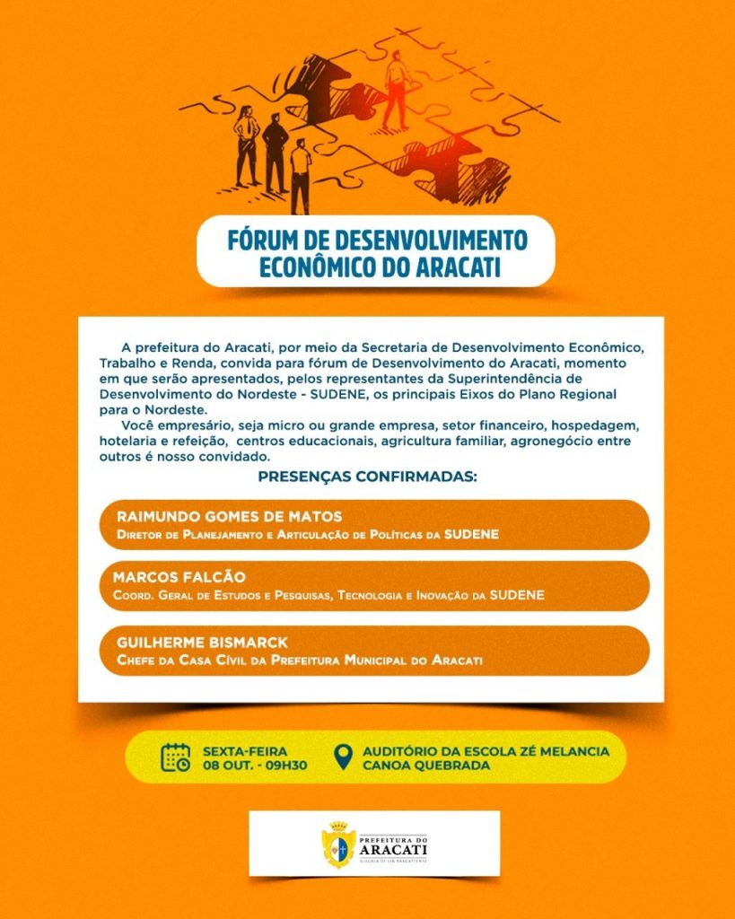 A Prefeitura do Aracati, por meio da Secretaria de Desenvolvimento Econômico, Trabalho e Renda, convoca empreendedores da cidade para o “Fórum de Desenvolvimento Econômico do Aracati” que acontece nesta sexta-feira (08) na Escola Zé Melancia, em Canoa Quebrada.