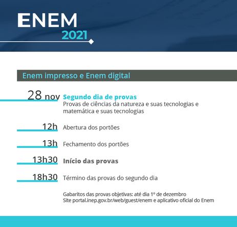 Assim como na prova do último domingo (21), é obrigatório o uso de máscara de proteção facial. O documento de identidade e a caneta esferográfica de tinta preta fabricada em material transparente também são itens obrigatórios na prova. No Enem digital, as respostas são dadas no computador, mas os participantes recebem uma folha de rascunho para fazer os cálculos à mão, por isso, a caneta é também necessária.