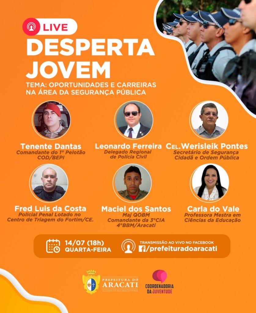 A live com o tema: “Oportunidades e carreiras na área de segurança pública” contará com a presença de vários especialistas: Tenente Dantas (Comandante do 1º Pelotão CODI/BEPI, Leonardo Ferreira (Delegado Regional de Polícia Civil), Cel. Werisleik Pontes (Sec. Municipal de Segurança Cidadã e Ordem Pública), Fred Luis da Costa (Policial Penal lotado no Centro de Triagem de Fortim), Maciel dos Santos (Maj/QOBM, Comandante da 3ª CIA do 4º Batalhão de Bombeiros Militares/Aracati) e Carla do Vale (Professora Mestra em Ciência da Educação).