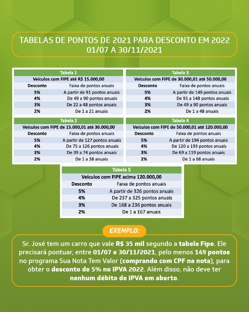 Para o benefício no IPVA 2022 serão computados os pontos acumulados a partir de documentos fiscais emitidos entre os meses de julho e novembro deste ano, podendo chegar em até 5% de desconto, com valor máximo para desconto de R$ 1 mil. A relação entre pontos necessários e respectiva redução, que varia de 2% a 5%, está condicionada a tabelas conforme o valor do veículo estabelecido pela FIPE. O benefício será concedido apenas para um único veículo cadastrado por CPF no programa.