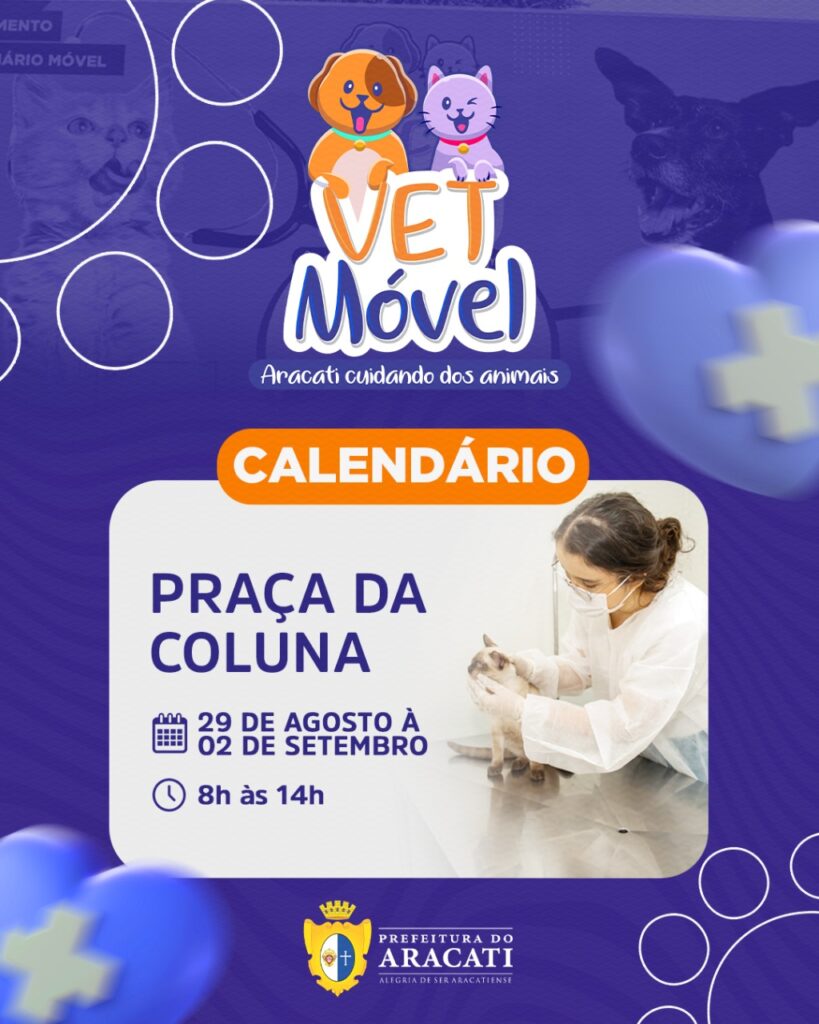 De 29 de agosto a 2 de setembro, o VetMóvel da Prefeitura Municipal estará realizando atendimentos na Praça da Coluna, sede do município.