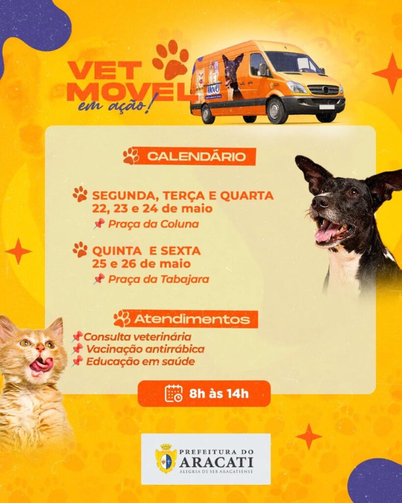 Nesta semana, de 22 a 26 de maio, o VetMóvel da Prefeitura Municipal do Aracati estará realizando atendimentos na Praça da Coluna e na Praça da Tabajara.