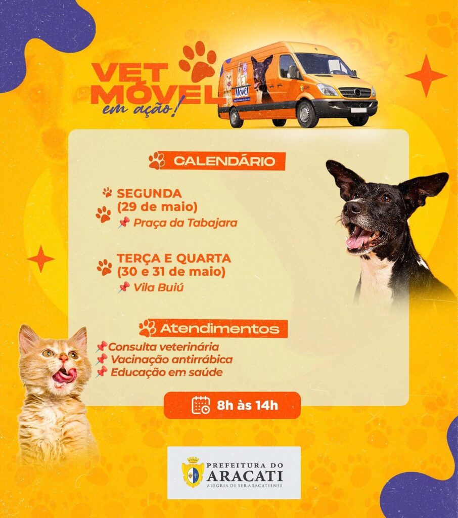 Nesta semana, de 29 a 31 de maio, o VetMóvel da Prefeitura Municipal do Aracati estará realizando atendimentos na Praça da Tabajara e na Vila Buiú.