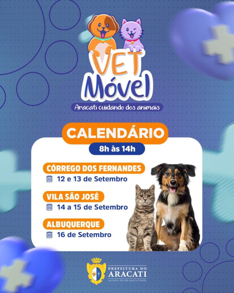 De 12 a 16 de setembro, o VetMóvel da Prefeitura Municipal estará realizando atendimentos no Córrego dos Fernandes, Vila São José e Albuquerque.